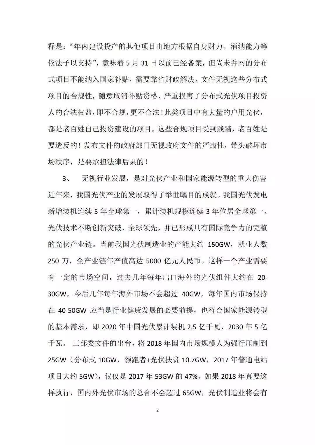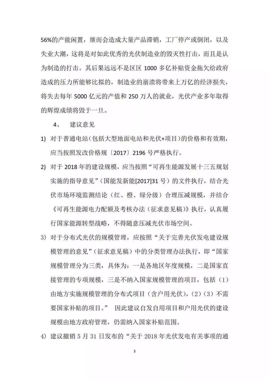 國家發(fā)改委宏觀(guān)經(jīng)濟研究院研究員、國務(wù)院政府特殊津貼專(zhuān)家、中國可再生能源學(xué)會(huì )光伏專(zhuān)委會(huì )副主任王斯成6月2日曾致函光伏專(zhuān)委會(huì )建議撤銷(xiāo)新政,在信中他表示,光伏“531”調整新政,不僅與以前發(fā)布的文件相矛盾,降低了政府信譽(yù),還將使光伏制造業(yè)崩潰,損失超萬(wàn)億,250余萬(wàn)人就業(yè)將受影響。