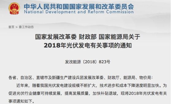 6月1日,國家發(fā)展改革委、財政部、國家能源局聯(lián)合印發(fā)了《關(guān)于2018年光伏發(fā)電有關(guān)事項的通知》。因文件落款時(shí)間為5月31日,業(yè)界將通知稱(chēng)為“531新政”或“光伏新政”。